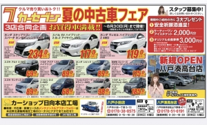 カーセブン八戸では3店合同企画の夏の暑さに負けない『真夏の中古車フェア』を開催しております。