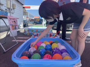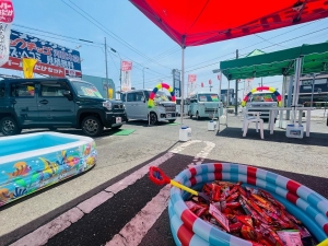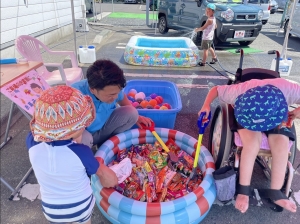 ご来場プレゼント、お菓子つかみ取り、ヨーヨー釣りなど少しでも夏祭りも感じてもらいながら