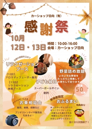 カーショップ日向 感謝開催のお知らせ 10/12(土)と10/13(日)
