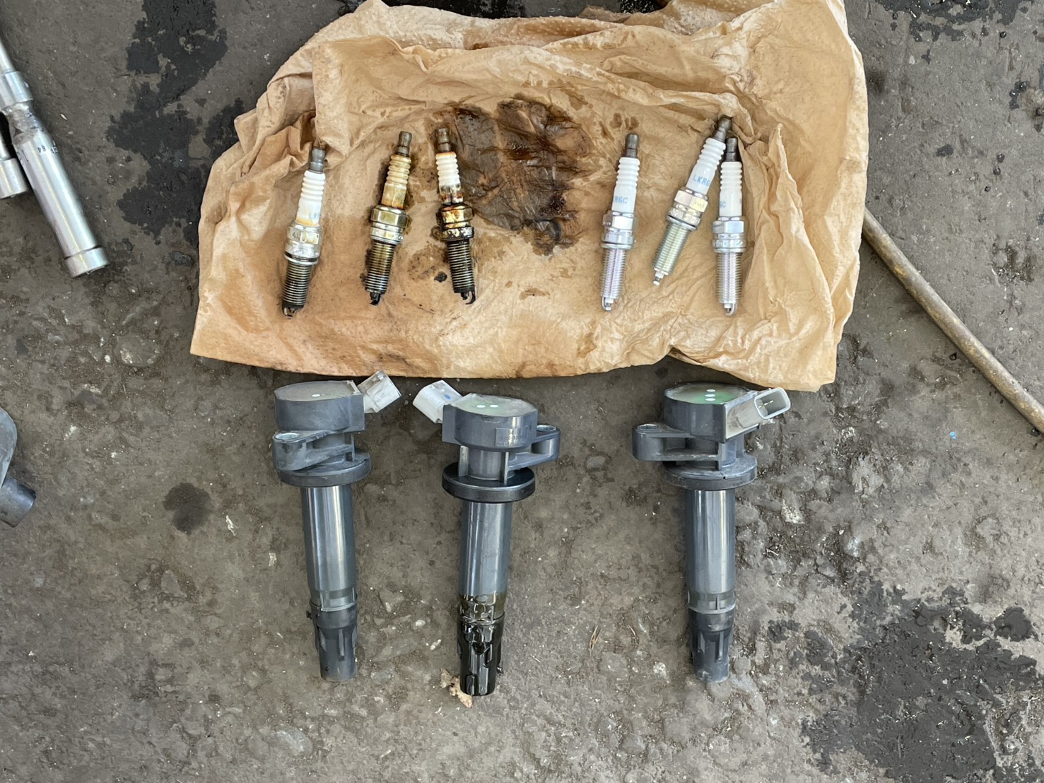 ヘットカバーのオイル漏れを修理とスパークプラグ交換、イグニッションコイルもオイルで劣化状態なので交換することになりました。
