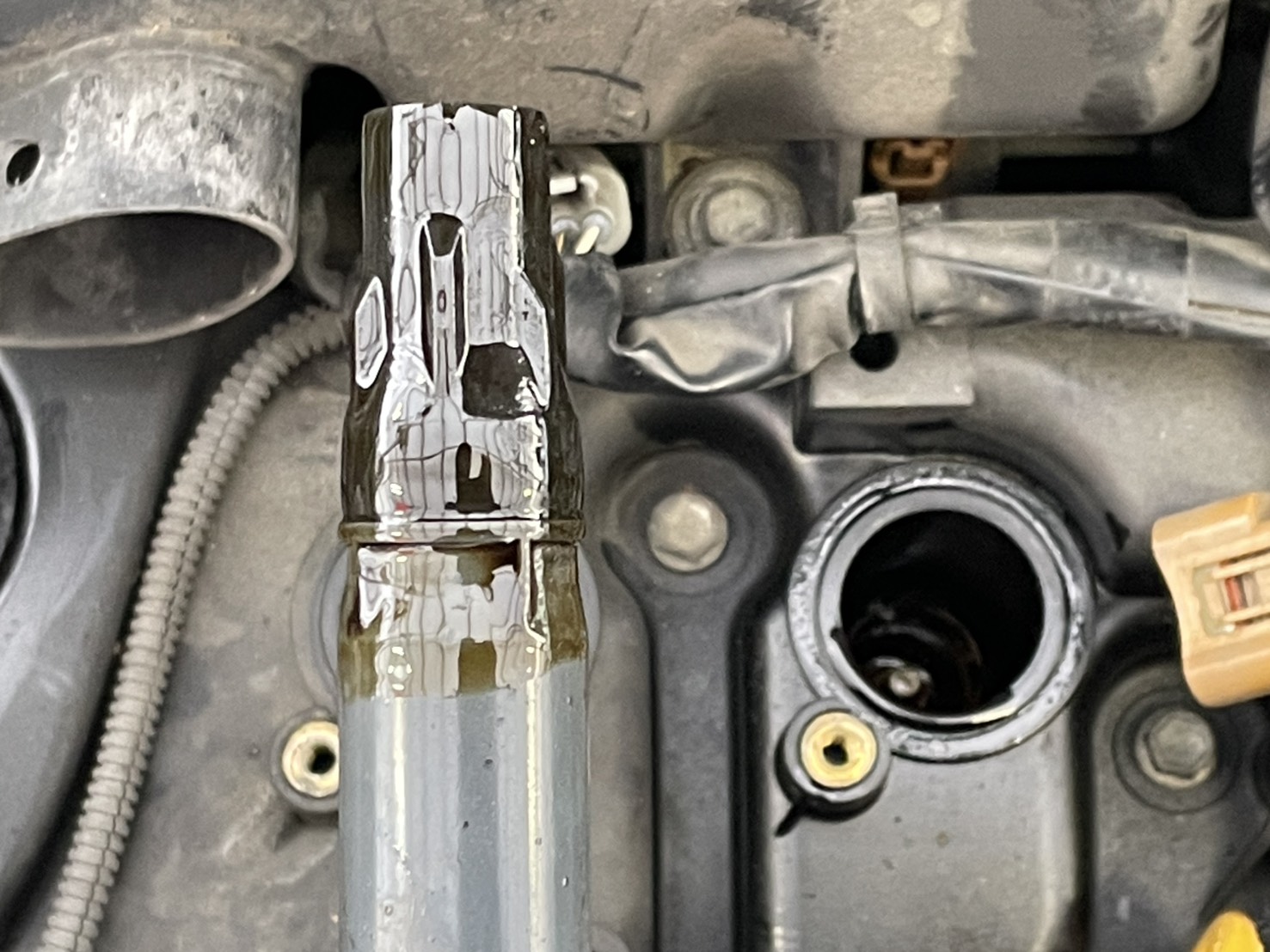 スパークプラグを点検しますと、プラグホールにエンジンオイルがたっぷり溜まっていました。