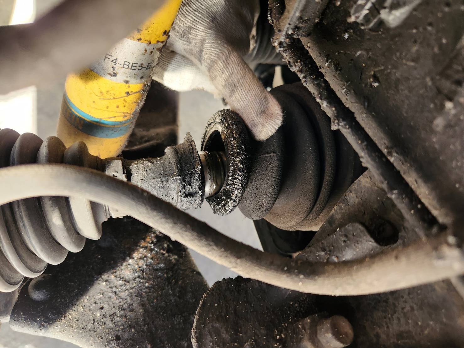 フロントドライブシャフトブーツが破れていましたのでブーツの交換となります。