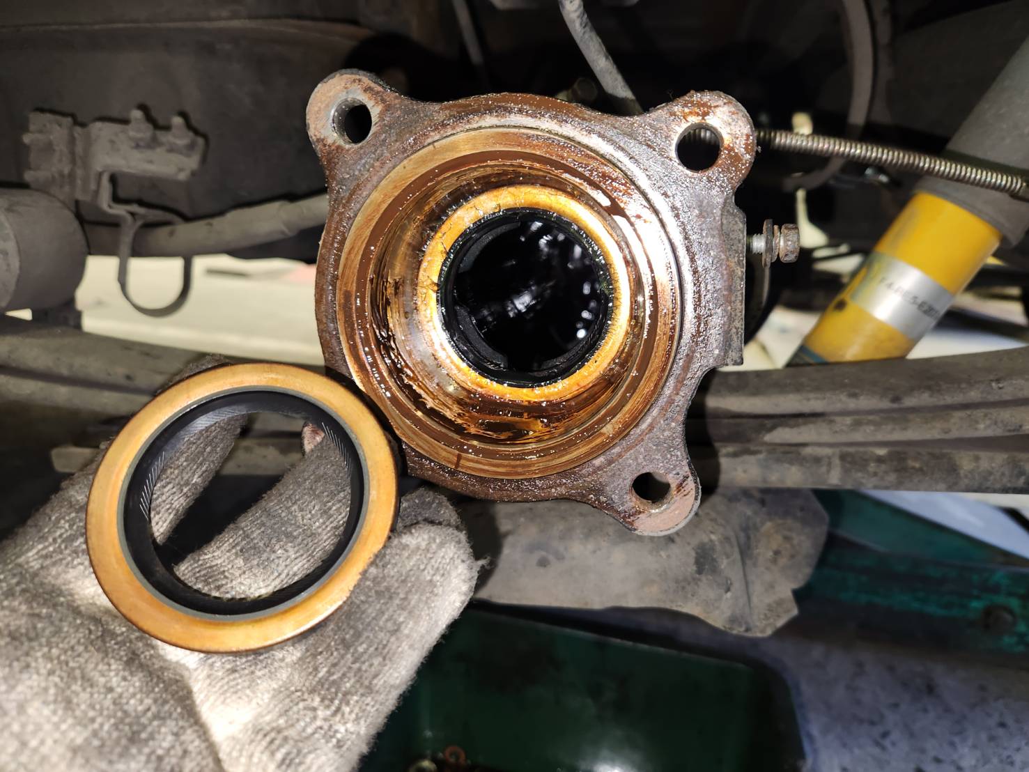 そして、お客様依頼事項の後ろ側から異音がする。やはりリヤのハブベアリングから異音していました。ベアリング交換ですね!!!