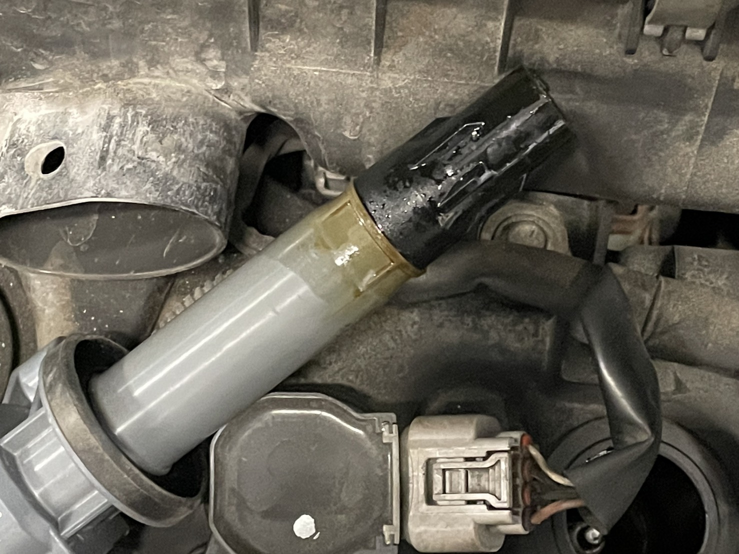 イグニッションコイルを外すと、『あ』これだなー!!! オイルで湿っていいました。ヘットカバーガスケットからオイル漏れをおこして点火系統に不具合を起こしていたと思われます。