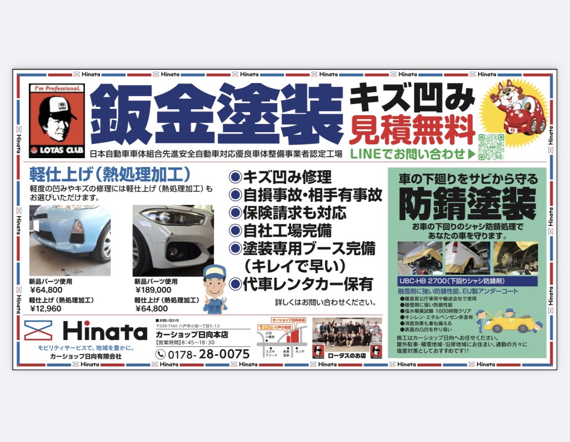 2025.11.01青森県八戸市で鈑金塗装・キズへこみ・事故修理は当社カーショップ日向へお任せください。お見積り無料です。 ミッド八通のチラシに掲載していただきました。
