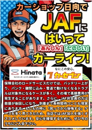 カーショップ日向・カーセブン八戸小田店でもJAF加入手続きが可能ですので、スタッフまでお声がけください。